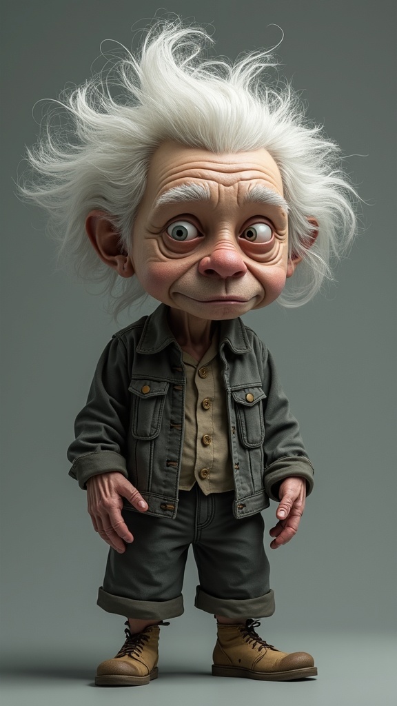 View this AI-generated image featuring elderly man with flowing silver hair standing alone features slightly blurred imperfect and abstract 3d render highlighting unusual artistic choices unconventional anatomy subtly present hands appear exaggerated face adorned with subtle makeup overall low resol