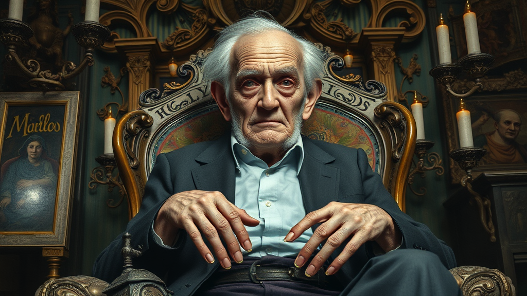 Elderly man seated in a chair surrounded by an elaborate and intricate setting, rendered in an artistic painting style with a close-up focus, capturing a cinematic and fantasy essence. The scene features low saturation and a gentle vignette effect. The character exhibits exaggerated and distorted features, incorporating elements of mutation and disfigurement. Limbs appear disjointed or missing, with malformed and blurry hands, and the occasional presence of floating or extra limbs. The composition maintains an eerie yet fascinating quality, with distorted and doubled facial features, creating a captivating yet unsettling visual experience. The background is complex, adding depth and dimension to the central figure without being overly vibrant or distracting.