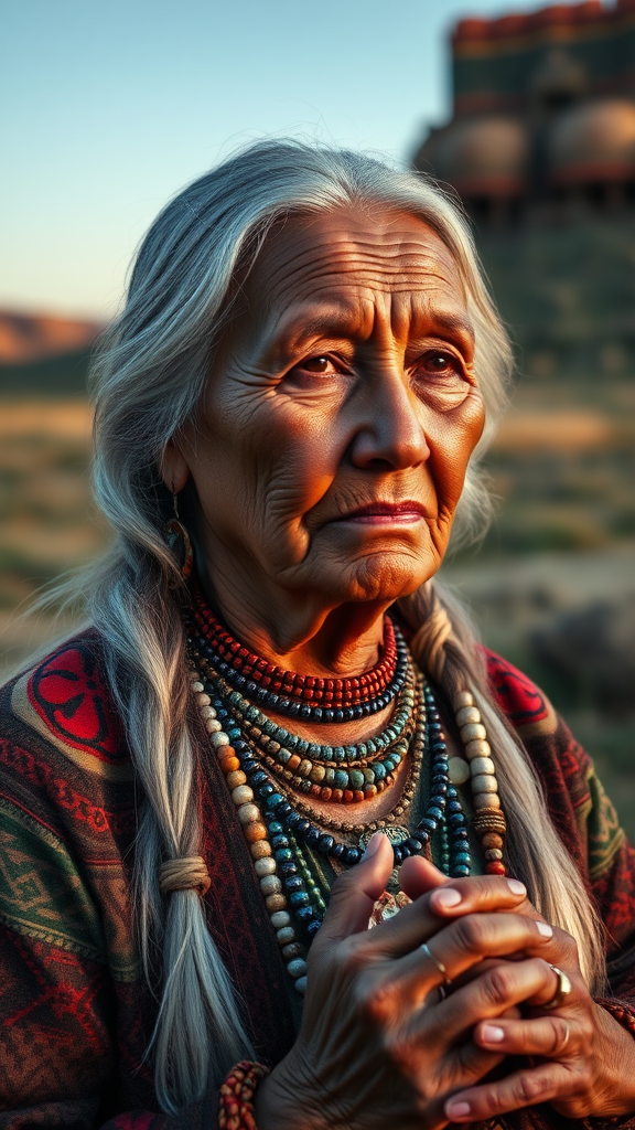 Elderly Native American woman, serene expression, layered jewelry, soft wrinkles, captured through an 85mm lens at f6, warm sunset hues casting gentle shadows, traditional attire with intricate patterns, tranquil landscape backdrop, long silver hair, weathered hands clasped in contemplation.