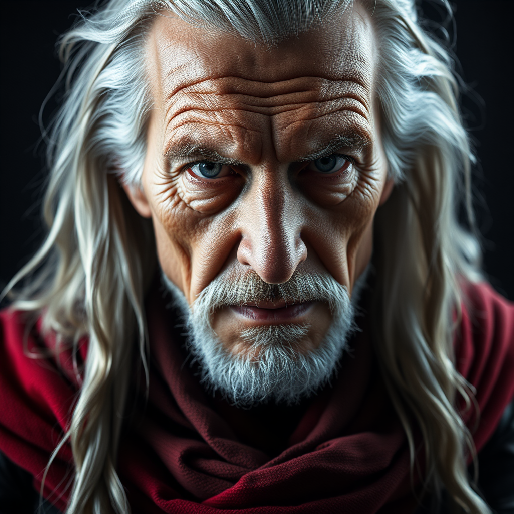 Elderly superhero man in an ultra-realistic portrait, photographed with Zeiss and Leica precision, reminiscent of Martin Schoeller's style. The image boasts stunning details under Rembrandt lighting, capturing the essence of an aged hero with intricate facial features. His long, silver hair is adorned with a subtle ornament, adding a touch of elegance. The studio setting enhances the hyper-detailed textures, while his skin glows with a gentle, dewy makeup finish. This captivating portrait blends the artistic influences of Artgerm and WLOP, creating a timeless and heroic depiction.