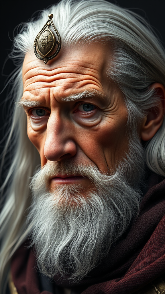 Elderly superhero man portrait, ultra realistic, photographed in the style of Martin Schoeller with incredible detail, utilizing Rembrandt lighting; the image captures an intense focus on the character's facial features, highlighting expressive lines and a dignified demeanor. A touch of creativity adds a regal hair ornament to his long, silver hair. The portrait combines Artgerm and WLOP influences, depicting him with a studio photo precision and a radiant dewy glow to emphasize his enduring vitality.