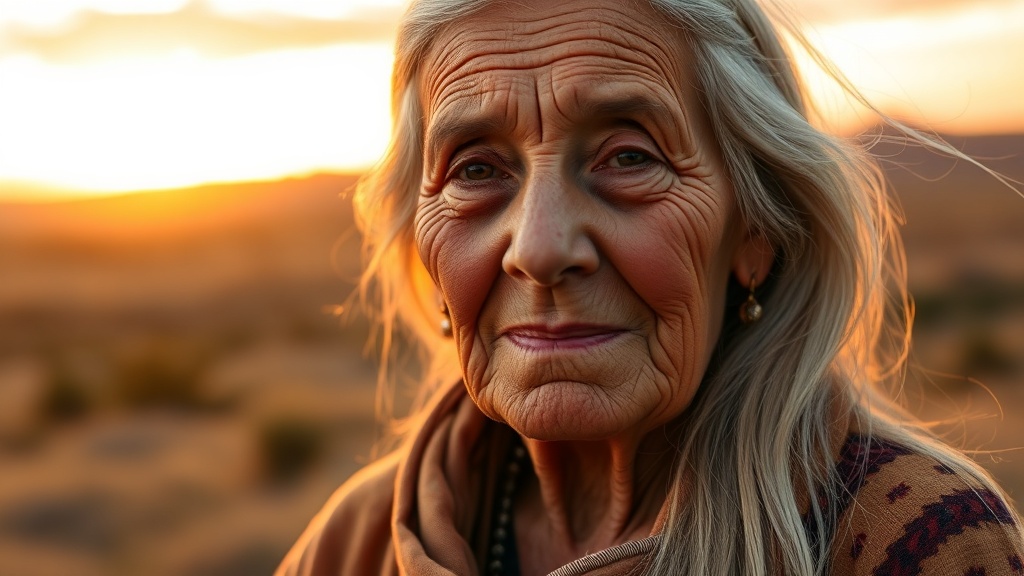 View this AI-generated image featuring elderly woman warm sunset glow 85mm f6 lens native american heritage serene expression gentle breeze soft earth tones in clothing wrinkles tell stories long silver hair peaceful landscape in the background. Created using advanced AI technology, this image showc