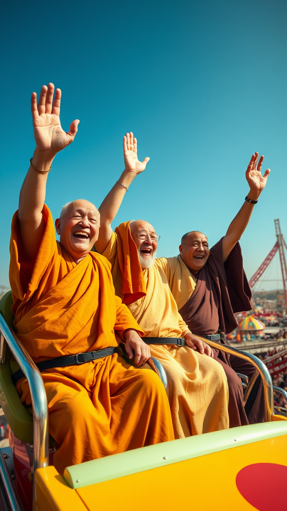 Elderly zen monks in traditional robes joyfully ride a rollercoaster with arms high, laughing under the bright sun at a lively amusement park. The scene captures their sense of wonder and childlike delight, cinematic light highlighting their serene expressions. The composition follows the rule of thirds, creating a dynamic action photograph with vivid colors and a backdrop of clear blue skies and distant attractions, emphasizing the contrast between their tranquil nature and the exhilarating ride.
