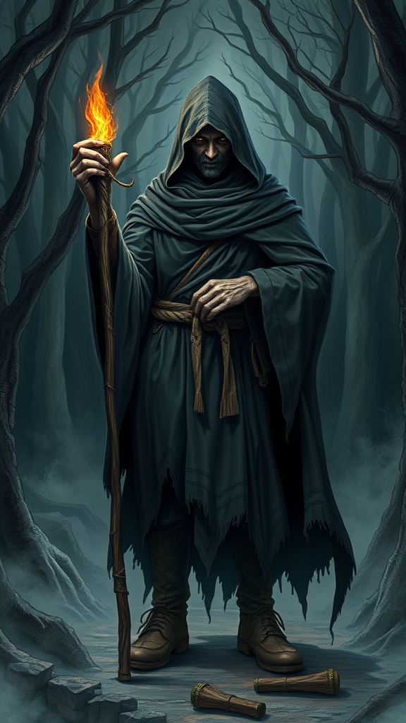 Eldreth, the sorcerer, clad in a dark, rumpled cloak, with an unyielding grip on his staff, its glowing tip conjuring a hypnotic aura. Standing within a haunting twilight forest, the air thick with foreboding mist, as treetops shroud the sky. A stark, single eye gleams from beneath his cowl, piercing through the gloom. The ground beneath Eldreth's feet seems about to give way, worn and treacherous from long years of tread, his boots worn into well-trodden paths.