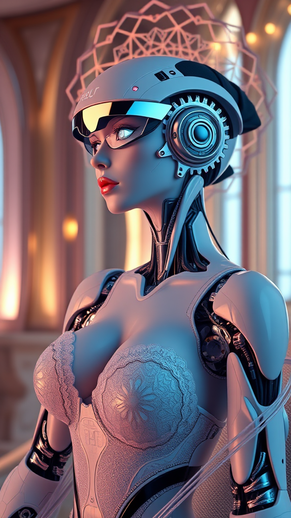ElectroKazumi: Cyber Pearl A 3D rendered masterpiece of a porcelain profile woman android in a luxurious cyberpunk atmosphere, meticulously crafted with octane render in 8k resolution. Standing at 150mm, she embodies elegance and beauty with her intricate lace-patterned bra and subtle curves, all subtly illuminated by soft studio lights and rim lighting. Her facial muscles are hyperrealistically detailed, revealing a depth of emotion behind her gleaming silver visor. As she sits in contemplation, intricate robotic parts and cable electric wires weave through her shoulders and chest, microchips gleaming like tiny jewels. A stylized H.R. Giger aesthetic influences her design, reflecting an octahedral shape within her eyes, floating above the background like an ethereal glow. Above her head, a delicate halo of fretwork displays intricate, nested mandalas in lustrous silvers and chrystials.