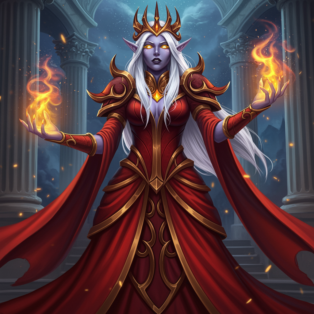 Elegance, beauty, and regal charisma echo in the aura of a magnificent queen, inspired by Azshara, casting spells with intense emotion and fiery passion. Her eyes glow a vibrant yellow, framed by cascading waves of sparkling, long white hair. She is adorned in an extraordinarily intricate and flowing red gown, which moves with its own grace. The backdrop is set against the grandeur of neoclassical architecture, bathed in ethereal moonbeam light and accented by the glow of scattered stars. The composition is epic, with a focus on intricate surface details reminiscent of a Roman goddess, captured in a full-body portrait. The scene is held in ethereal lighting with rich hues, achieving a hyperrealistic quality in 8k sharp focus. Every detail is expertly crafted in a contemporary realism that stands out, evoking the quality of award-winning art, set in a complex and mesmerizing style.