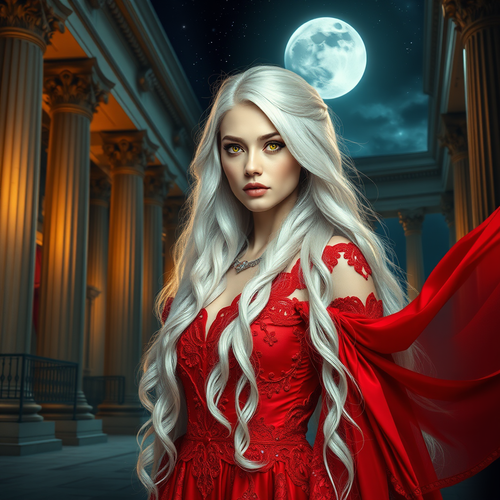 Elegance mixed with the allure of a gorgeous queen, evoking the mystical essence of Azshara, intertwined with emotive spells of intensity, passion, and grace. Eyes with a glowing yellow hue, cascading long hair in shimmering white, adorned in a flowing, intricate, vibrant red gown. The backdrop features neoclassical architecture, bathed in moonbeam light and starlight, creating an epic and intricately detailed scene. Embracing a Roman goddess style, the full-body portrait captures ethereal lighting, harnessing HSL to enhance photorealistic qualities. In stunning 8K, 1080p resolution, the sharp and depth-focused image embodies contemporary realism. With hyperrealistic detail and ultra-quality, this award-winning art style maintains complexity and elegance.