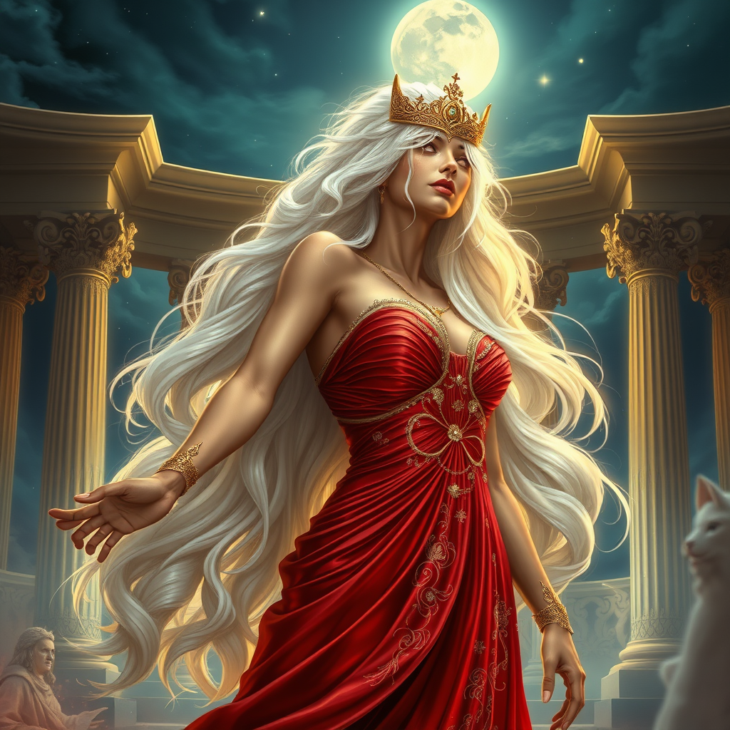 Elegance stunning monarch Azshara spell reading emotional intense passion grace eyes glowing yellow long white hair sparkling exquisite long red dress intricate flowing neoclassical architecture background moonbeam light star-lit sky epic composition detailed surface Roman goddess style full body portrait ethereal lighting photorealistic ultra-high-definition sharp focus depth of field contemporary realism hyperrealism exceptional quality intricately designed award-winning art style