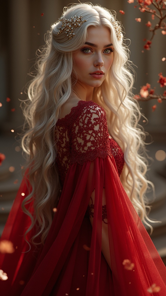 elegancegorgeousqueenazshara&castingspell\emotional\passionate\graceful, eyes+amber+glowing, silveryhair&glistening, luxuriantcrimsondressintricate&flowing, renaissancearchitecture\setting, Moonbeamsillumination, starlitglow, grandiose composition, detailed surface texture, roman-goddess-inspired, full body portrait, Ethereal Glow, HSL, photorealistic, 8k, 1080p, sharp clarity, depth of field, modern realism, hyper-detailed, ultra-quality, intricate, award-winning art style --ar 2:3 --q 2 --s 1000