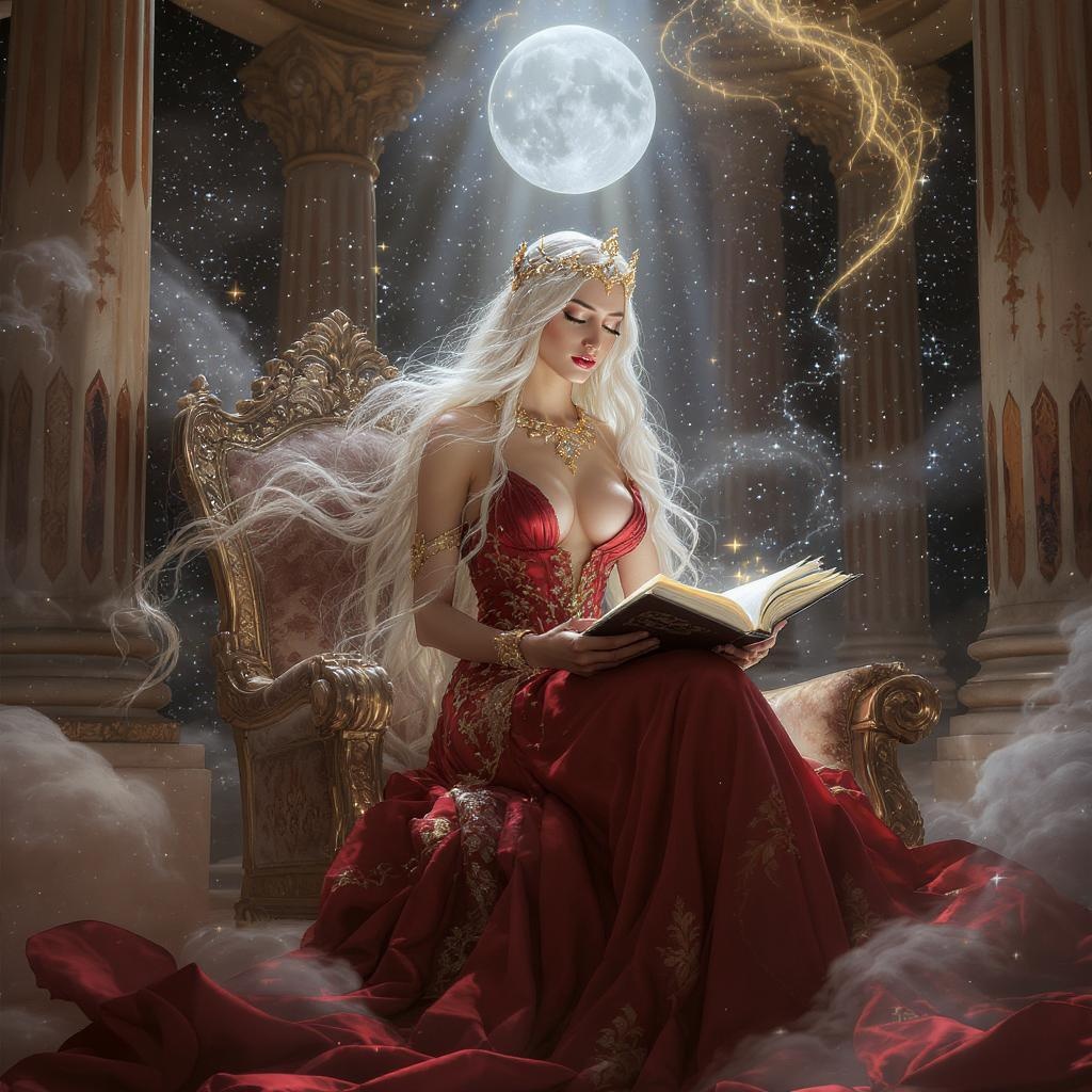 EleganceGorgeousQueenAzshara&spellbindingReading\emotional\intense\passion\grace, eyes+amber+glowing, cascadingwhitehair&shimmering, flowingcrimsondressdetailed&graceful, neoclassicalarchitecture\setting, Moonbeambeamlight, starlusterglow, grandcomposition, intricate texturing, roman-goddess-aesthetic, full body image, Ethereal Illumination, HSL enhanced, photo-realism, ultra-high definition, 8k, 1080p, sharply focused, depth emphasis, modern realism, hyper-realistic, premium-quality, complex design, award-winning art style.