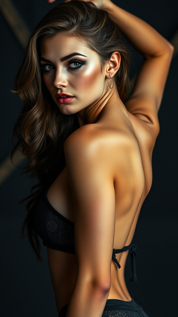 Elegant and captivating, a stunning woman with a mesmerizing presence and athletic physique, showcasing an exquisite silhouette, intriguing contours, and alluring dark eye makeup, inspired by the style of Jessica Drossin, rendered in a unique artistic vision.