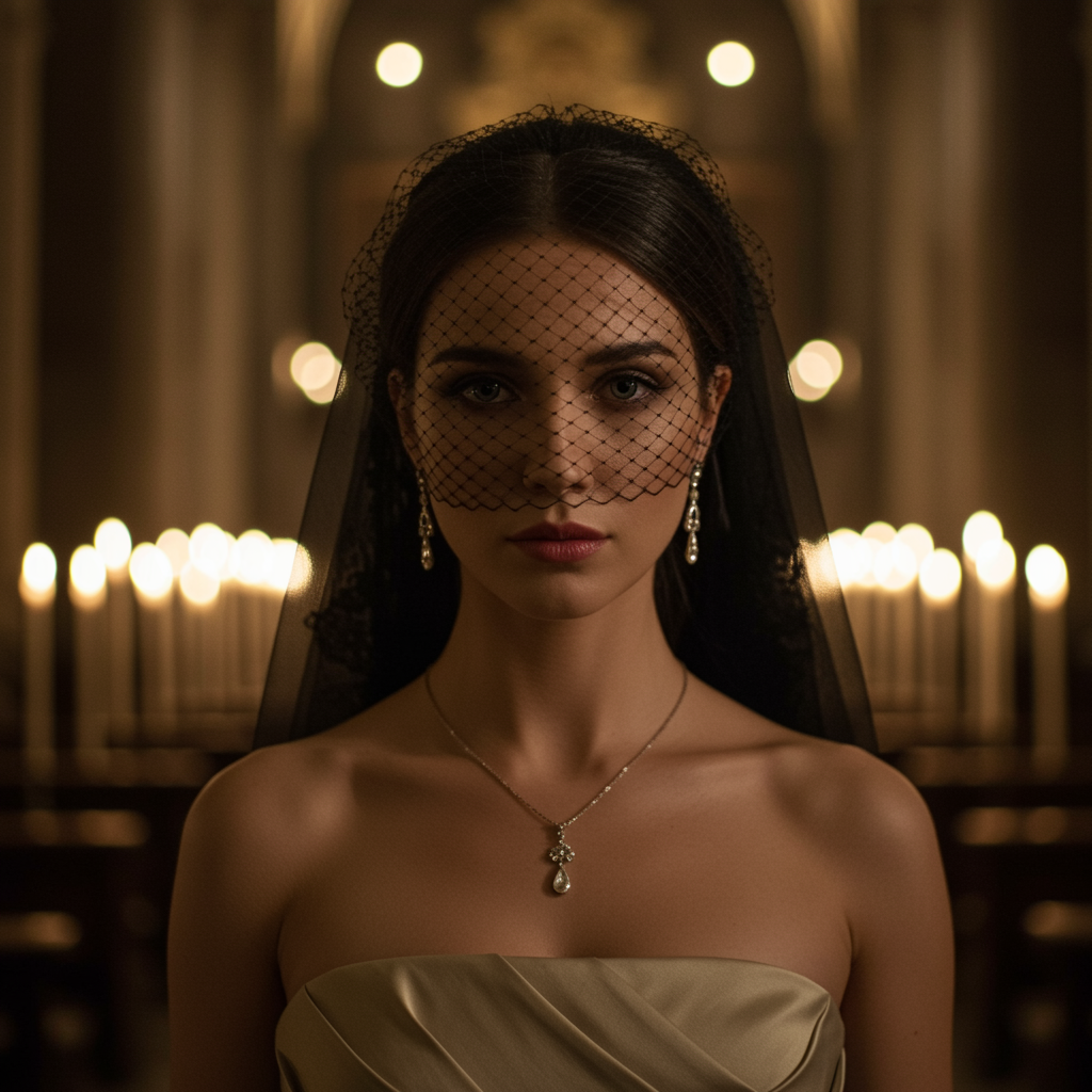 Elegant and evocative, the portrait captures a beautiful Spanish widow exuding a serene confidence. Her expressive eyebrows and lovely, bright eyes glisten with a quiet intensity, framed by an angelic face partly obscured beneath a delicate black veil. The portrait adheres to the golden ratio style, with dramatic lighting casting soft shadows that enhance her grace. She wears a strapless gown, adorned with simple yet exquisite earrings and a delicate necklace, radiating understated sophistication. In the background, the flickering glow of candles in a grand church creates a warm bokeh effect, enveloping the scene in a sense of reverence and tranquility. The atmosphere is reminiscent of CinémaScope, and the world is undeniably beautiful, adding layers of depth and emotion to the composition.