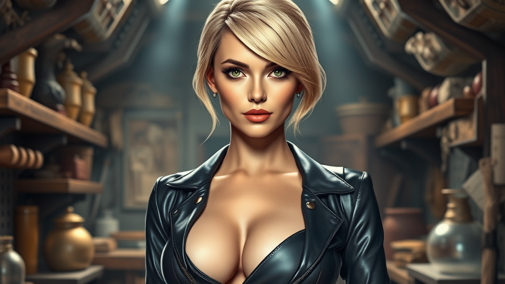 Elegant and glossy, a thepit bimbo-style woman stands poised, her look captivating with symmetric features and a detailed face. Her cute demeanor is accentuated by a plunging neckline and small breasts. With green eyes and realistic pupils, she exudes allure. Her blonde hair frames her face, embodying the essence of a superhero. She wears a sleek leather outfit, her form perfectly centered as she looks down slightly. The full-body portrayal highlights her realistic skin, with pores, subsurface skin scattering, and a shiny finish. Her midriff is exposed, adding to her charm. In the background, a detailed bunker setting complements the scene, filled with items reflecting a vintage 1800s retro style. Light rays and caustics enhance the ambiance, achieving a masterpiece quality with hyperrealistic sharp focus and good anatomy, her skin blushing, and her presence commanding.