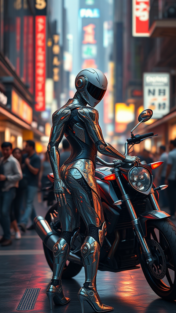 Elegant android in a chrome cybernetic and futuristic exo-suit, poised beside a motorcycle amidst the hustle of a crowded cyberpunk city street, bathed in neon luminosity, cinematic ambiance, utilizing unreal engine, photorealistic, vibrant 3d render, 32k resolution, capturing an expressive, dynamic essence.