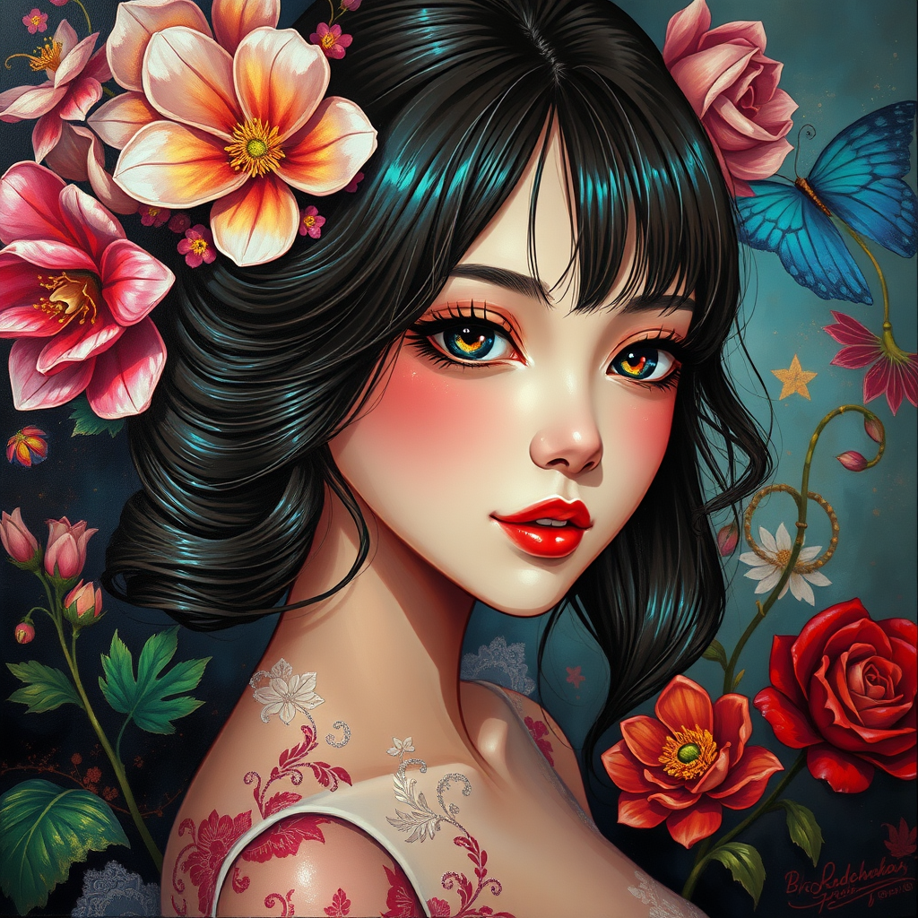 Elegant anime-inspired oil painting, featuring a stunning girl with thick acrylic textures and vibrant iridescent reflections, adorned with intricate flower decorations, dramatic chiaroscuro lighting and divine cinematic rim highlights, infused with opulent rococo art elements, aspect ratio 2:3.