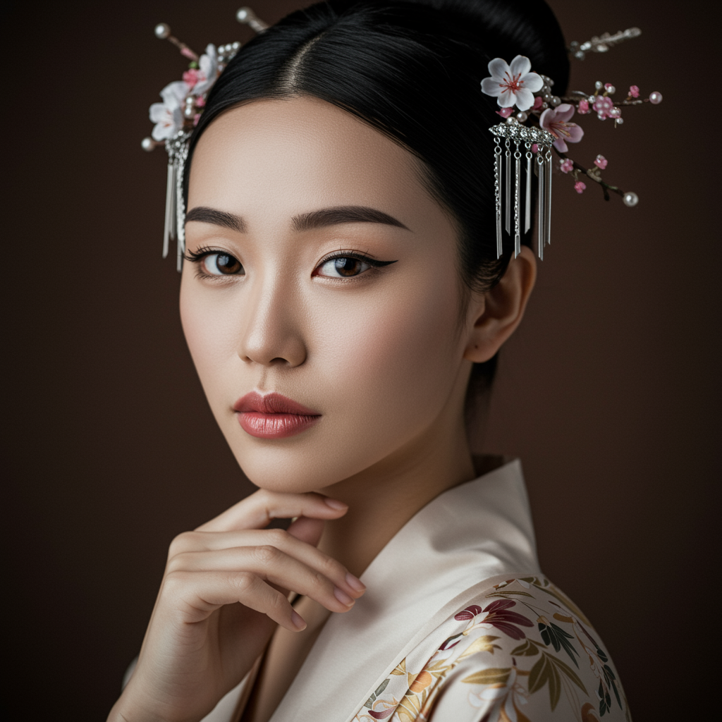 Elegant Asian woman, silky porcelain skin, pristine and luminous, otherworldly charm, monolid eyes rich and profound, mesmerizing gaze, delicate eyeliner enhances their mystique, gracefully arched eyebrows express gentle emotions, Lips touched with a hint of cherry blossom hue, Draped in flowing silk kimonos and intricate hair adornments that amplify her captivating presence, RAW portrait, professional photography, ultra high resolution, 4k.