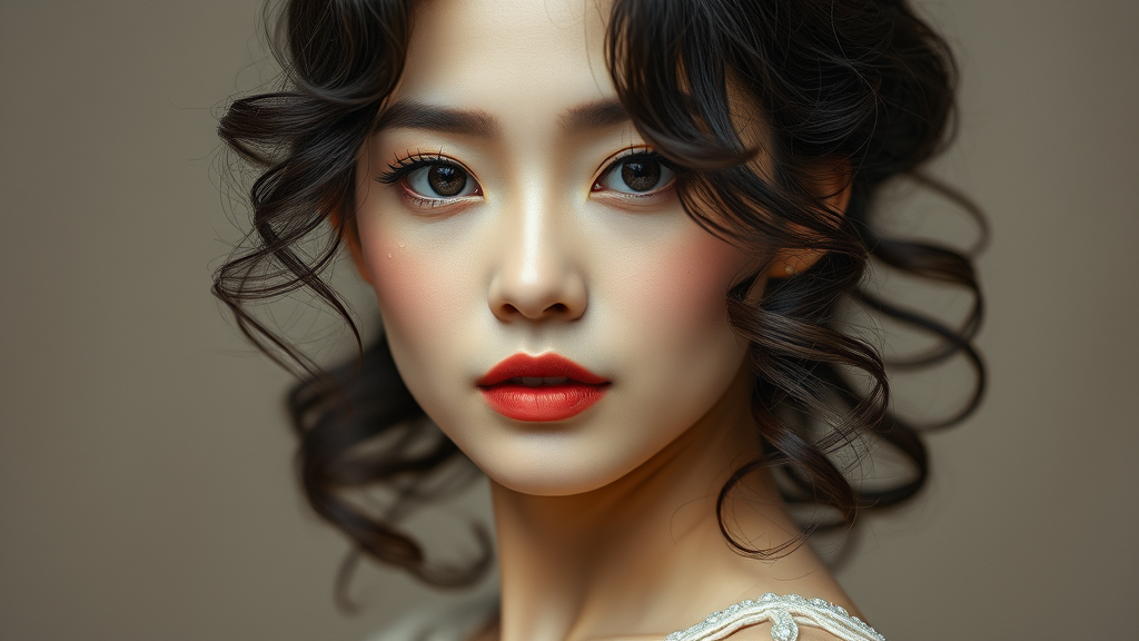 Elegant Asian woman, her hair beautifully curled, captured in the style of a Samyang AF 14mm f/2.8 RF lens, infused with elements of oshare kei. She is styled in dark beige tones, with hyper-realistic droplets of water accentuating her distinct facial features, blending mori kei with hints of hallyu. The composition is artistic and stylized, maintaining a unique aspect ratio of 73:110 with a creative touch that elevates the scene.