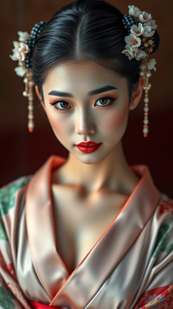 Elegant Asian woman, luminous porcelain skin, breathtaking and ethereal, monolid eyes dark as night with a mesmerizing gaze, eyeliner enhancing their allure, gracefully arched eyebrows suggest gentle expressions, lips like cherry blossoms with a soft hue, draped in luxurious silk kimonos, decorated with intricate hairpieces adding depth to her captivating aura, RAW portrait, expert photography, high resolution, 4k, BadNegAnatomyV1-neg, easynegative, FastNegativeV2, ng_deepnegative_v1_75t, rmadanegative402_sd15-neg, verybadimagenegative_v1.3, bad artist -neg.