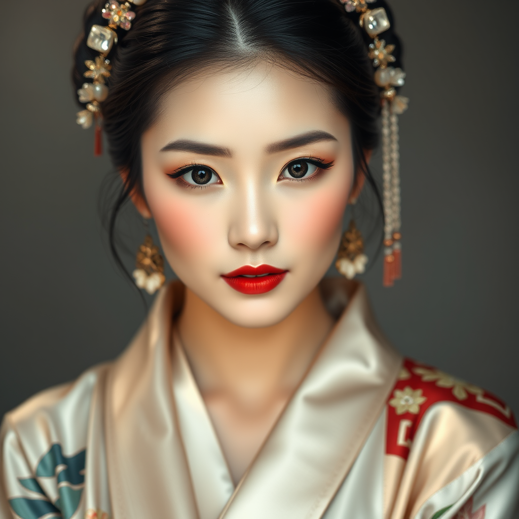 Elegant Asian woman, porcelain skin, radiant and flawless, ethereal grace, monolid eyes dark and alluring, mesmerizing gaze, eyeliner enhances their charm, arched eyebrows reflect gentle emotions, cherry lips subtly tinted, draped in luxurious silk kimonos, intricate hairpieces enhancing her captivating presence, RAW portrait, professional photography, high resolution, 4k.