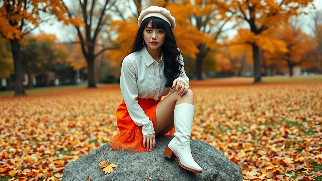 Elegant Asian woman with lustrous black hair and chic bangs, her eyes dark and captivating, full lips accentuated with subtle makeup, dressed in a detailed white blouse paired with a stylish white beret and a vibrant burnt-orange skirt. She completes the look with pristine white boots. Perched gracefully on a large rock amidst a park setting, the scene is alive with vivid autumn hues, a carpet of leaves underfoot. The sky is overcast, adding a touch of mystique, while the composition maintains a high-fashion, editorial flair with a professional, detailed finish.