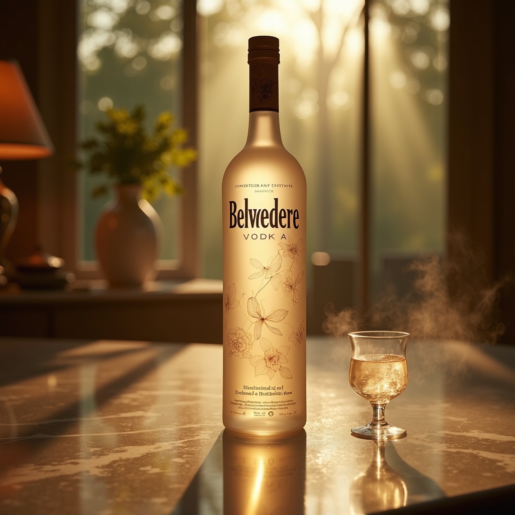 View this AI-generated image featuring elegant belvedere vodka bottle standing majestically on a polished marble surface illuminated with soft golden ambient lighting to create a luxurious atmosphere in the background a subtle silhouette of lush trees through frosted glass windows hinting at the vod