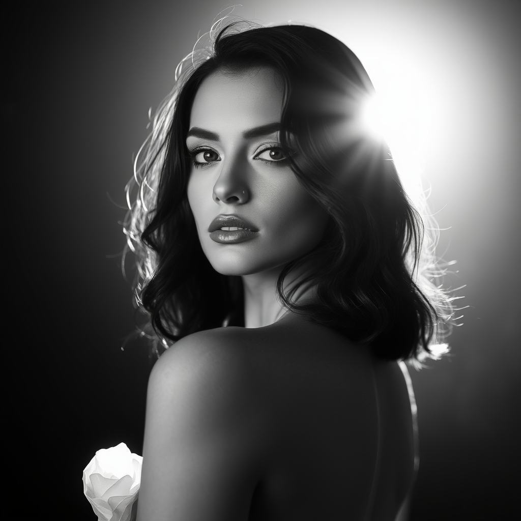 Elegant black and white fashion editorial inspired by Bruce Davidson, featuring a dark-haired woman, captured with long exposure through an artistic lens, high-resolution and realistic, professional photography with a cinematic angle, dynamic backlighting creating a bright halo effect, accompanied by a soft, dreamy bokeh backdrop.