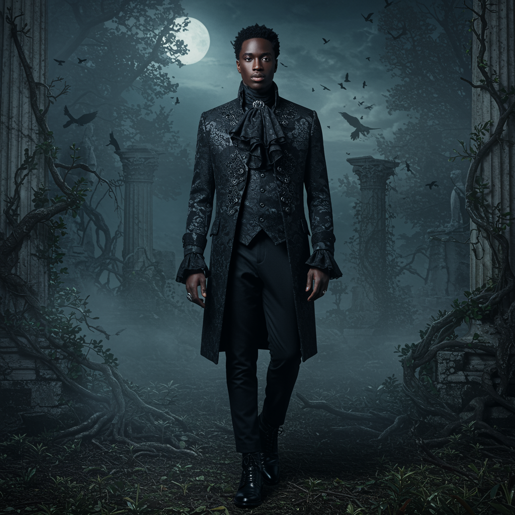 Elegant Black gentleman in a dark, enchanting fantasy realm, adorned in avant-garde attire mixing baroque elements with a modern twist, surrounded by misty, moonlit landscapes and ancient architectural ruins intertwined with nature.
