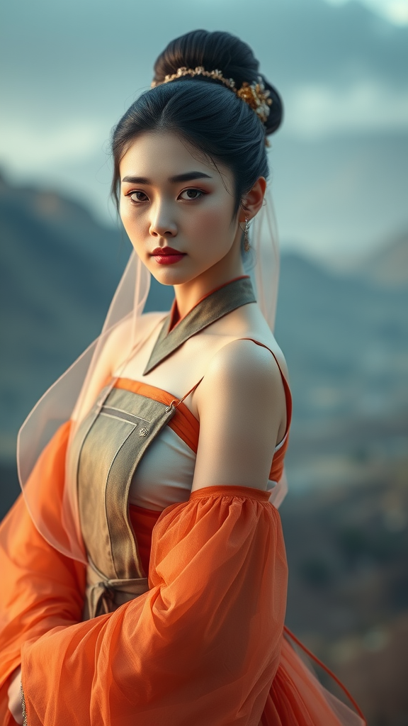 Elegant Chinese Tang Dynasty Beauty, single figure, inverted triangle face, ballerina bun, gazing at the viewer, exquisite features, adorned in silk attire and tulle dress, wearing an apron, tube top, and belt, accented with a sheer veil and an orange sleeveless top, flowing skirt, set against a mystical Dunhuang landscape. Her eyes convey sorrow, a melancholic expression with tears glistening, embodying a sense of looking forward yet indecisive, capturing a delicate and enchanting aura. This portrayal of a lovely, descending fairy exudes photorealistic allure, infused with a touch of BadDream.