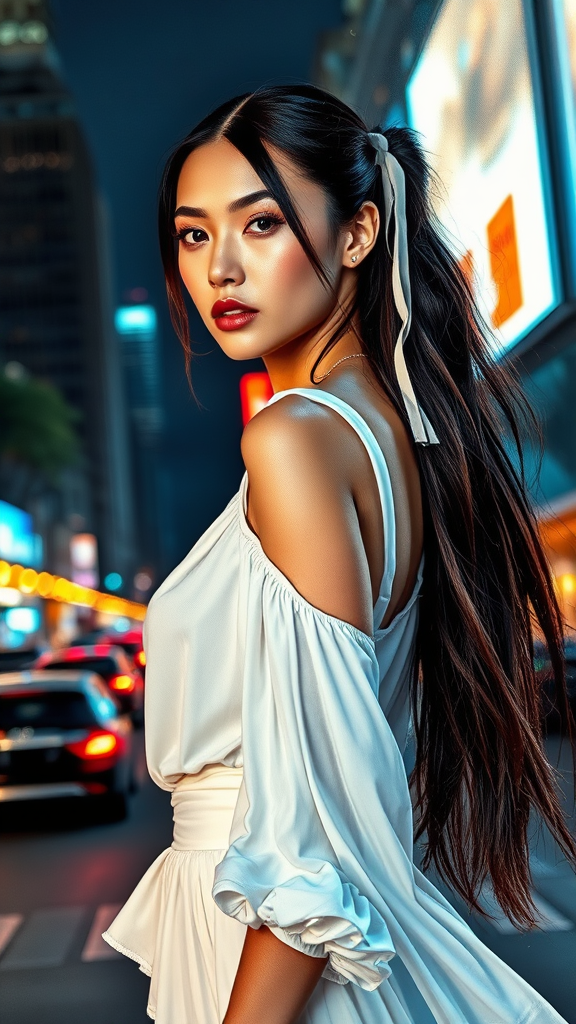 Elegant city night scene, vibrant streetlights, watercolor style, stunning woman in airy white blouse and flowing white skirt, futuristic fashion with unique straps, graceful shoulder accents, adorned with long hair ribbons, full-body portrait, luminous and captivating design, intricately detailed face, reminiscent of a model photoshoot, exceptionally long hair, sophisticated and realistic hdr elements, enhanced by dramatic backlighting, high quality, striking close-up.