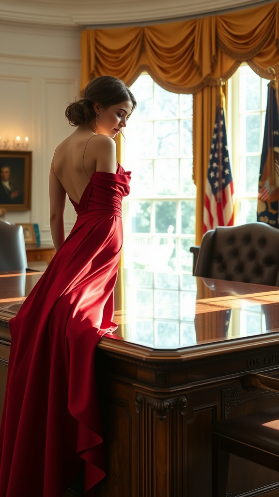 elegant crimson dress elegantly draped over the corner of an oak desk, bright and cozy atmosphere of the white house oval office, f2.8 depth highlighting intricate details, soft lighting casting gentle shadows, presence of a sophisticated woman subtly implied in the scene