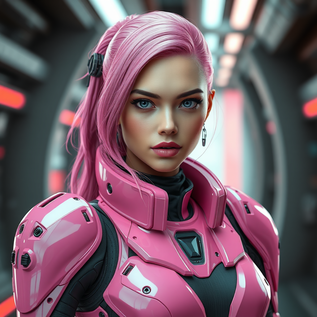 Elegant cybernetic female in sleek pink combat armor, vibrant pink hair, embodying a bold cyberpunk aesthetic, futuristic and alluring. She's a striking figure, exuding charm with her confident pose, set against a futuristic backdrop. Her portrait captures intricate details, featuring realistic textures and a captivating gaze. The scene is rendered in cinematic 3D realism, with diffused soft lighting and a sharp focus on her expressive face. The photography-style image displays high detail, showcasing lifelike skin and a dynamic composition. It's a visual feast, blending sci-fi allure with artistic finesse, avoiding common digital distortions and ensuring a clean, polished presentation.
