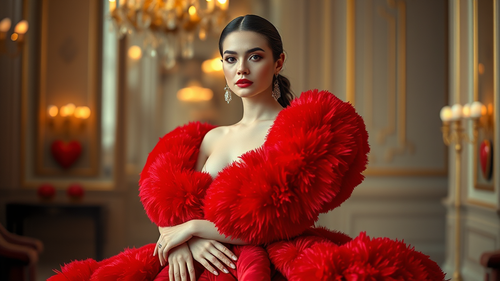 Elegant fashion shoot showcasing a stunning female model adorned in a luxurious oversized plush red heart-shaped gown, captured in sharp focus and high detail with a cinematic and glamorous flair. The scene is symmetrically arranged and impeccably lit, mirroring the sophistication of a Vogue editorial spread, ideal for a fashion magazine feature.