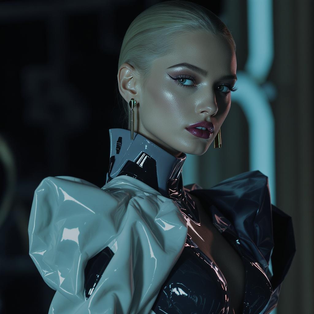 Elegant female model gazing diagonally, adorned in avant-garde and futuristic attire, featuring glossy plastic and sleek latex fabrics, intricate geometric designs, asymmetric tech-inspired embellishments, ultra-detailed, high-resolution, medium shot, cinematic style photography, reminiscent of Iris van Herpen's visionary fashion.