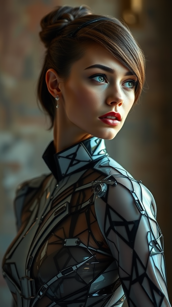 Elegant female model, gazing intensely to the side, adorned in avant-garde and futuristic attire, featuring sleek plastic and glossy latex fabrics, intricate abstract geometrical patterns, asymmetric high-tech embellishments, ultra-high-definition, medium shot, cinematic lighting, inspired by Iris van Herpen's artistic vision, aspect ratio 3:4, enhanced sharpness 750.