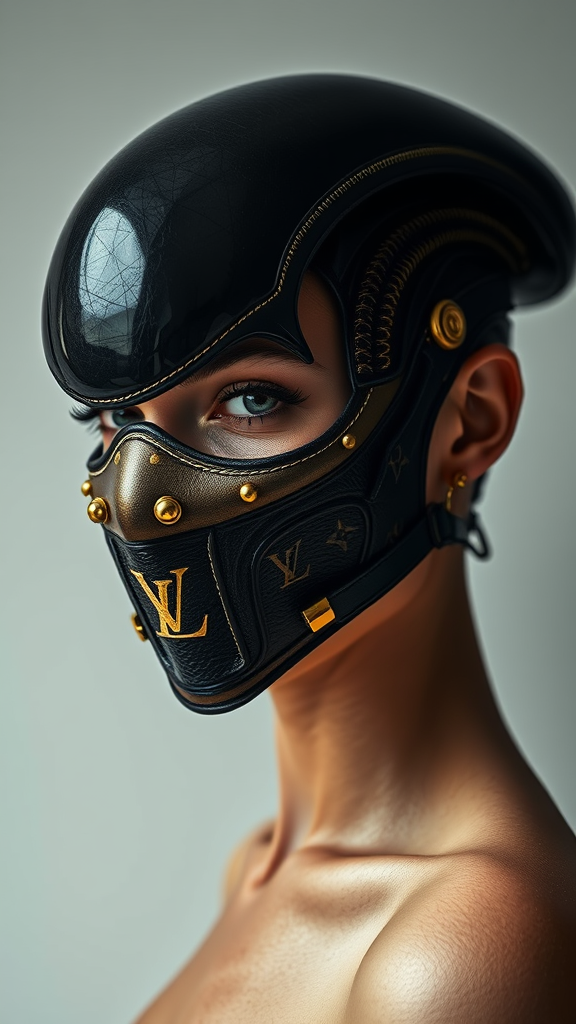 Elegant fusion of sci-fi and fashion, envision a high-end face mask inspired by the iconic face hugger from Aliens, reimagined with Louis Vuitton's signature luxury. The mask features intricate leatherwork and gold accents, seamlessly blending the organic creature design with opulent LV monogram details. Highlighted against a backdrop of minimalistic elegance, the model exudes sophistication and avant-garde allure, showcasing a perfect synergy between cutting-edge style and classic luxury. The photography captures the essence of this unique accessory, balancing bold creativity and refined craftsmanship.