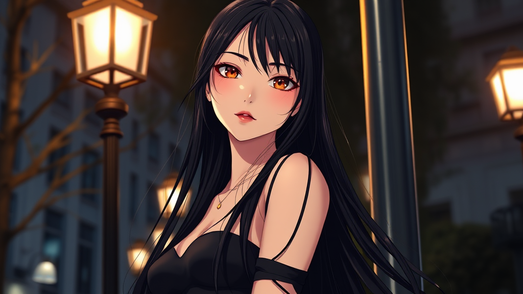 Elegant girl with a striking face, featuring long flowing black hair and a tall, slender figure, standing gracefully under a lamppost. Rendered in a detailed anime style, she is captured in a glamor shot with beautiful, cinematic lighting that enhances her features. The scene is created in an ultra-realistic, hyper-detailed manner with volumetric lighting, brought to life using advanced rendering techniques. The composition is shot with a 150mm perspective, delivering a photorealistic quality while avoiding elements like bad anatomy, blur, or disfigurement, ensuring the portrayal remains sophisticated and captivating.