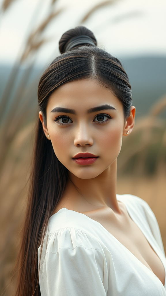 Elegant girl with long hair styled in a sleek bun, set against a natural backdrop, captured in a headshot portrait. The beauty photography emphasizes minimalist makeup with a high-fashion, editorial vibe, reminiscent of trends seen on Vogue and Unsplash. This image carries a sense of detailed elegance and intricate design akin to hyperrealism, utilizing 3D model techniques as seen in Maya, showcasing a symmetrical face and single figure. The high-resolution texture in 4k displays depth and clarity, celebrating youth and aesthetic grace.