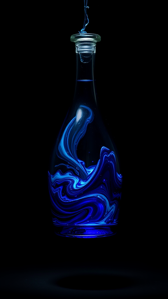 Elegant glass bottle filled with swirling deep blue liquid, suspended in a void of darkness, evoking an aura of mystery and intrigue, with reflections catching the light, maintaining an intense focus on the bottle's intricate details and form, aspect ratio 9:16, high quality, raw and unfiltered style.