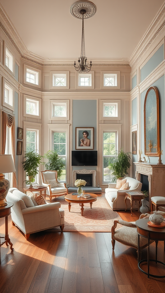Elegant high-resolution photography captures a luxurious living room with a dreamy ambiance. Featuring a wooden floor and cozy classical furniture, the space is adorned with tasteful decorations, creating a warm and inviting atmosphere. The high ceiling enhances the room's grandeur, while small windows offer picturesque glimpses of the lush garden outside. A harmonious palette of beige, blue, and soft salmon pastels infuses the room with a serene charm, reminiscent of an interior design magazine layout. The room exudes a refined yet cozy elegance, blending classical design with a touch of modern sophistication.