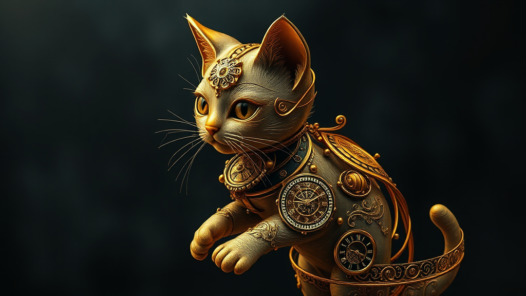 Elegant kitten crafted in gold with intricate clockwork and filigree designs set against a moody, abstract dark background; an interplay of light and shadow highlights its detailed, lifelike features; capturing essence in photorealism and hyper realism; conveying a sense of dynamic movement as if in acceleration; rendered in cinematic quality with long exposure; 8K super resolution and HD clarity; proportions maintained in a square aspect ratio.