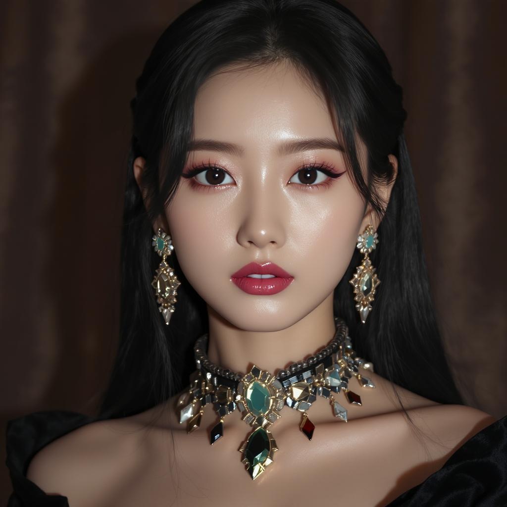 Elegant Korean girl, kpop idol, with stunning beauty, dramatic lighting accentuating her symmetrical features, realistic and in sharp focus, HD quality, highly detailed, intricate and lifelike photography. The image is in hyperrealistic style with elements of raytracing and physics-based rendering, featuring nvinkpunk jewelry. It merges the essence of CGI and 3D design with a touch of doll-like aesthetics, reminiscent of anime and illustration in digital art. Avoids distortion or low quality elements, ensuring natural anatomy with proportional limbs and clarity throughout.