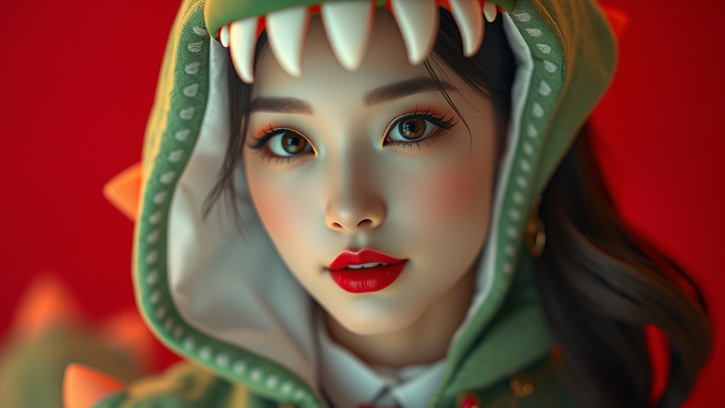 Elegant Korean woman, k-pop idol style, adorned in a playful dinosaur costume, featuring perfectly symmetrical eyes, captured in ultra high-resolution, hyperrealistic 8K detail with dramatic lighting akin to professional photography. Her lips are softly painted with red lipstick, complemented by intricate jewelry. The scene is enriched with CGI and 3D elements, blending the charm of a doll-like appearance with the vibrancy of an anime and cartoon essence. This digital painting illustrates a fusion of art styles, with hints of octane rendering bringing out the glossy texture. Despite elements of text, cropped composition, and jpeg artifacts, the image maintains its high-quality allure with a touch of formal sophistication, accentuated by a tie and buttons, all set against a richly red backdrop.