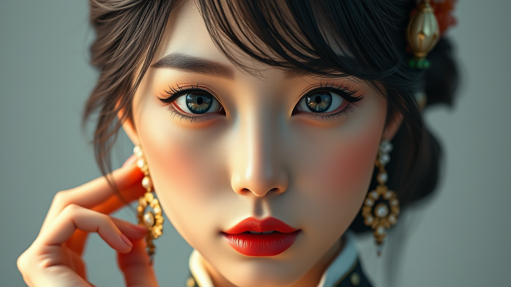 Elegant Korean woman, kpop star, striking symmetrical eyes, ultra high resolution, photorealism, 8k detail, hyperrealistic, dramatic lighting of a studio photo, adorned with exquisite jewelry, CGI enhanced, 3d model characteristics, lifelike render, touches of cartoon and anime flair, captivating illustration style, digital art mastery, vibrant digital painting, hints of textured brushwork, carefully cropped composition, minor jpeg artifacts, sophisticated attire with tie and buttons, subtle play on low resolution textures.