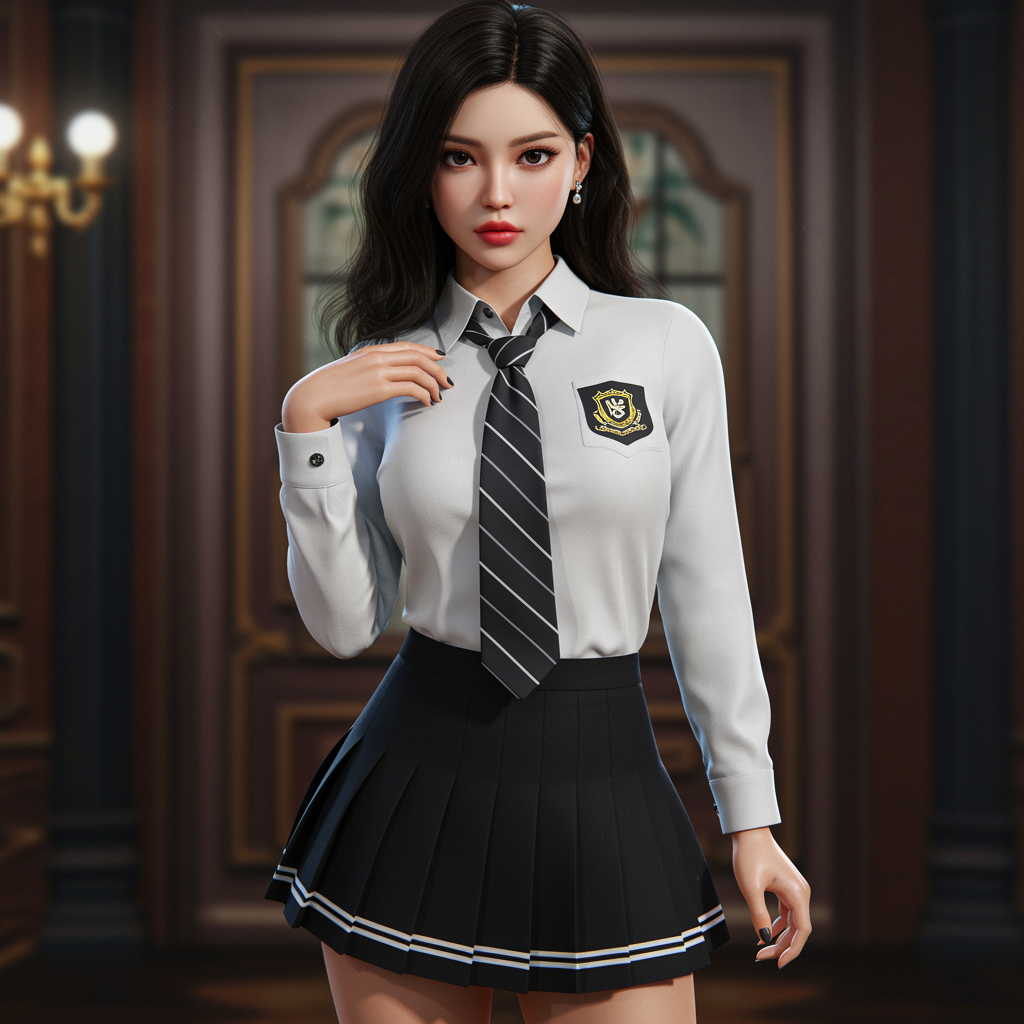 Elegant Korean woman wearing a chic black pleated tennis skirt, featuring perfectly symmetrical eyes, captured in ultra high-resolution photorealism with dramatic lighting reminiscent of professional photography. Adorned with exquisite jewelry, the composition melds the lifelike detail of CGI and 3D art with the whimsy of a doll-like aesthetic. This stunning scene, rendered in Octane, blurs the lines between reality and cartoon with influences from both anime and illustration. The digital painting is vibrant yet subtly textured, capturing every nuance, down to the refined touch of a tie and buttons, all while emulating the charm of a dreamlike, slightly otherworldly portrait.