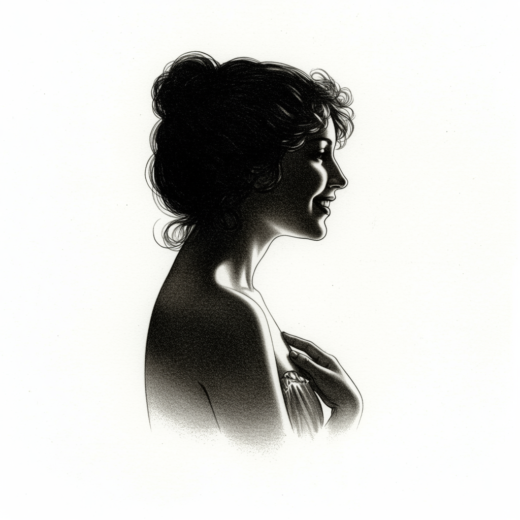 Elegant lithograph featuring a graceful woman in side profile, a gentle smile playing on her lips. Set against a pristine white background, the composition is illuminated with striking, atmospheric lighting. This artwork is a delicate sketch reminiscent of Odilon Redon's style, capturing a surreal and dreamlike quality while subtly incorporating modern elements for a fresh twist.