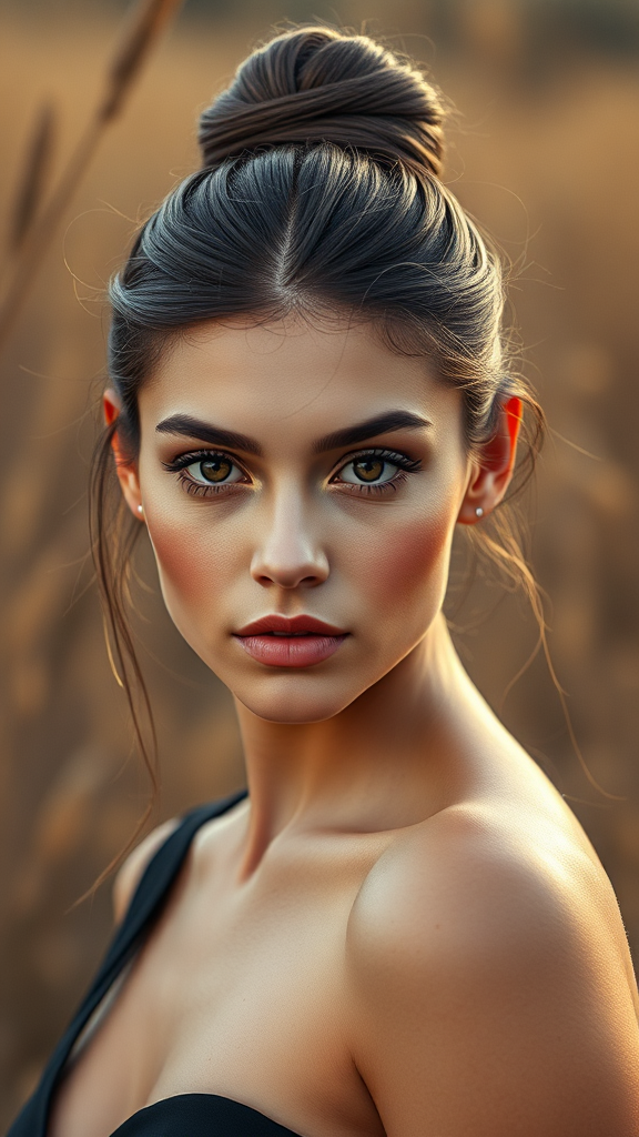 Elegant long-haired woman with a sleek bun set against a natural background; this headshot portrait embodies beauty photography with minimalist makeup, radiating high fashion and editorial flair. The image resembles those trending on platforms like Vogue and Unsplash, showcasing detailed, intricate elegance in hyperrealism. Inspired by a 3D model crafted in Maya, her face and body are perfectly symmetrical. It's a single, striking face captured in high-resolution texture at 4k quality, with vibrant color, precise framing, and sharp focus, exuding youth, beauty, and sophistication.