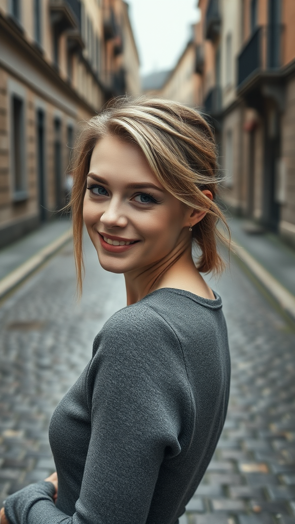 Elegant professional portrait of Anya Taylor-Joy posing with effortless smile on a worn, granite cobblestone street, ultra-realistic concept art with intricate, sharp focus and depth of field, shot with a 85mm lens at f/1.8, 4k resolution, trending image with slight deconstruction: Anya's frame is partially out of frame, her left arm is withered and twisted, her face has an additional age-worn wrinkle, and she's sporting a few strands of dyed, murkily-blonde hair combed over her forehead, shot in muted, charcoal tones with a grayscale palette.