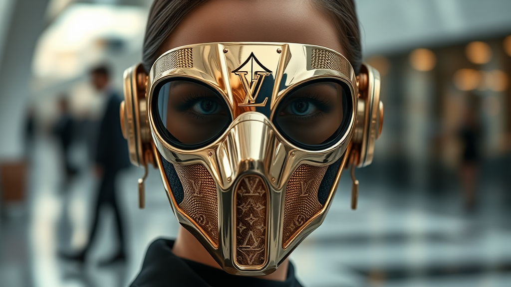Elegant reinterpretation of iconic Face Hugger as opulent Louis Vuitton face mask, crafted with premium materials and intricate detail, seamlessly blending sci-fi allure with high fashion sophistication, model showcases in professional advert photography, capturing luxury and innovation, set against a backdrop of modern elegance, highlighting craftsmanship and exclusivity, rich textures and signature LV motifs subtly integrated, avant-garde fashion accessory for discerning clientele.