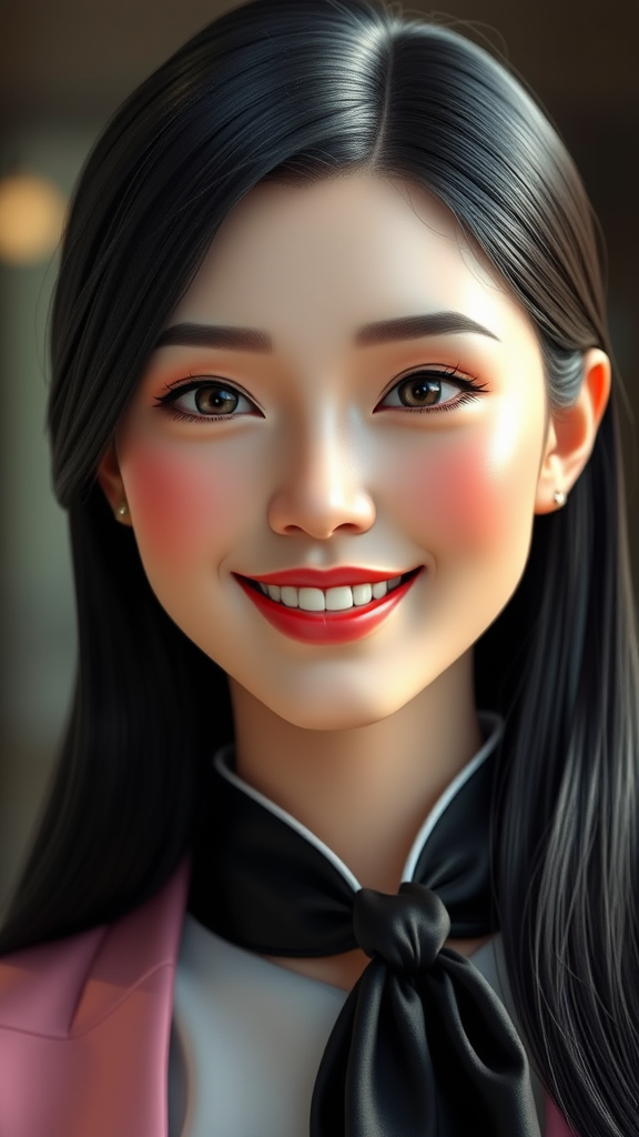 Elegant, sophisticated woman with a strikingly detailed and beautiful face, featuring silky black hair and a stylish tie. Her luminous, smooth white skin conveys a sense of health and vitality. She is smiling warmly, resembling a high-end 3D CGI model with a doll-like quality. The image is expertly rendered in octane, with a focus on clarity and precision. Care is taken to avoid low resolution, excess noise, and any digital imperfections. Her posture and features are perfectly proportioned, with natural anatomy and a graceful presence. The composition emphasizes a balanced, aesthetically pleasing appearance, avoiding any errors or distortions.