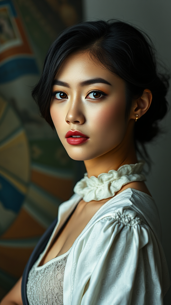 Elegant woman dressed as a French artist, painter, gazing confidently at the viewer, portrait photography capturing detailed skin textures, rendered in stunning photo-realism at 8k resolution. The full-length composition showcases her style, enhanced by high detail RAW color art. She wears a subtle piercing, and her presence is softened by diffused lighting, with a shallow depth of field ensuring sharp focus. The image embodies hyperrealism with cinematic lighting, depicting an Asian descent. The artistic vision avoids low quality, jpeg artifacts, or any visual distortions like extra or mutated features, ensuring a beautifully proportioned, well-composed portrait without any digital blemishes or errors.